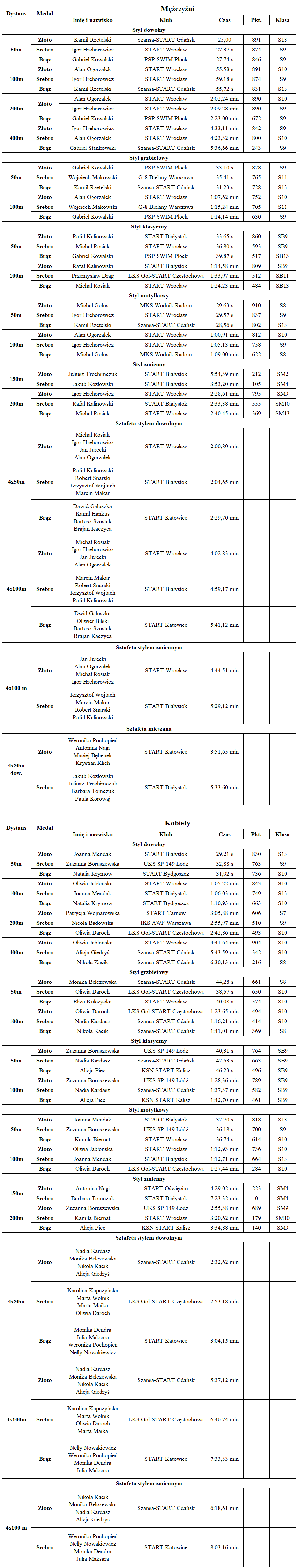 Rywalizacja toczyła się pod dyktando pływaków STARTu Wrocław, którzy wyłowili z wody lwią część złotych łupów. Ekipa z Dolnego Śląska triumf w medalowej klasyfikacji imprezy przypieczętowała rekordowym dorobkiem 68 krążków (39 złotych, 19 srebrnych i 10 brązowych). Najmocniejszymi ogniwami we wrocławskim zespole okazali się medalistka paraolimpijska, mistrzyni świata i Europy Oliwia Jabłońska, a także posiadacze solidnych „papierów” na równie błyskotliwą międzynarodową karierę – Igor Hrehorowicz i Alan Ogorzałek. Drugą pozycję zajęli zawodnicy STARTu Białystok, do których powędrowały ostatecznie 54 medale (26-21-7), a czołową trójkę uzupełnili przedstawiciele LKS Gol-Start Częstochowa z 50 krążkami na koncie (24-16-10). Co warte podkreślenia, w końcowym zestawieniu ujęte zostały wszystkie kluby.